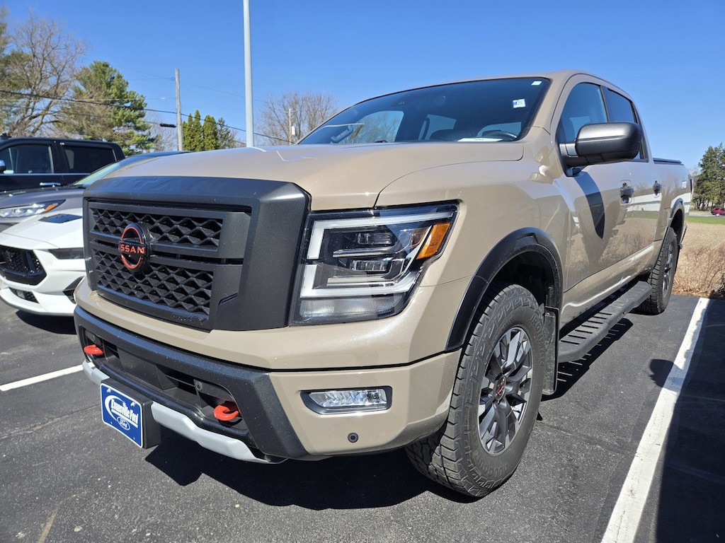 Recent Arrival! Titan PRO-4X LOCAL TRADE, 120V Outlet in Bed, 3.69 Axle Ratio, 4-Wheel Disc Brakes, 6 Speakers, ABS brakes, Air Conditioning, Alloy wheels, AM/FM radio: SiriusXM, Auto High-beam Headlights, Auto-dimming Rear-View mirror, Auto-leveling suspension, Automatic temperature control, Bed Assist Grip, Blind Spot Warning, Brake assist, Cloth Seat Trim w/Vinyl Bolsters, Compass, Delay-off headlights, Driver door bin, Driver vanity mirror, Dual front impact airbags, Dual front side impact airbags, Electronic Locking Tailgate, Electronic Stability Control, Emergency communication system: NissanConnect Services, Fender Premium Audio System w/12 Speakers, Front & Rear Parking Sensors, Front anti-roll bar, Front Bucket Seats, Front Captain's Seats, Front Center Armrest, Front dual zone A/C, Front fog lights, Front reading lights, Front wheel independent suspension, Fully automatic headlights, Garage door transmitter: HomeLink, Heated door mirrors, Illuminated entry, Knee airbag, Leather steering wheel, LED Tailgate Area Illumination, LED Under Rail Bed Lighting, Low tire pressure warning, Navigation system: NissanConnect Navigation, Occupant sensing airbag, Outside temperature display, Overhead airbag, Overhead console, Panic alarm, Passenger door bin, Passenger vanity mirror, Power door mirrors, Power driver seat, Power Sliding Rear Window w/Defogger, Power steering, Power windows, PRO-4X Badged Floor Mats, PRO-4X Illuminated Kick Plate, PRO-4X Mud Flaps, PRO-4X Rugged Step Boards, PRO-4X Utility Package, Radio data system, Radio: NissanConnect w/Navigation, Rain sensing wipers, Rear anti-roll bar, Rear Bumper Step w/Electronic Tailgate Lock, Rear Parking Sensors, Rear reading lights, Rear seat center armrest, Rear step bumper, Rear Underseat Storage, Rear window defroster, Remote keyless entry, Security system, Speed control, Speed-sensing steering, Speed-Sensitive Wipers, Split folding rear seat, Steering wheel mounted audio controls, Tachometer, Telescoping steering wheel, Tilt steering wheel, Traction control, Trailer Brake Controller, Trip computer, Utilitrack System w/4 Tie-Down Cleats, Variably intermittent wipers, Voltmeter. CARFAX One-Owner. Clean CARFAX.